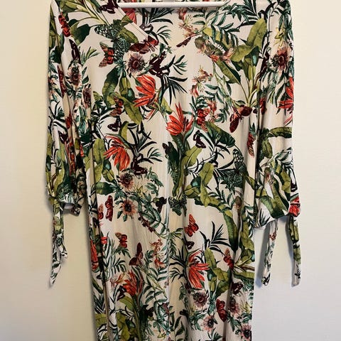 En vid klänning i crêppad chiffong med tryckt mönster. Volangkrage och djup öppning bak med smala knytvand i nacken och ryggen. Lång ballongärm med puff vid axelen samt smal, klädd resår och kort volangkant vid ärmslut. Delvis trikåforad.
