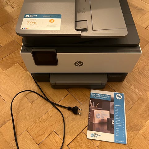 Ungefär ett år gammal lite använd och fungerar. Den fungerar med WiFi för olika enheter och med AirPrint så kan du skriva ut direkt från en iPhone, iPad Mac utan drivrutin. Medföljer manual och 220V kabel. Inget papper eller färgpatron följer med. Vill du veta mer om den så finns det info på nätet.
