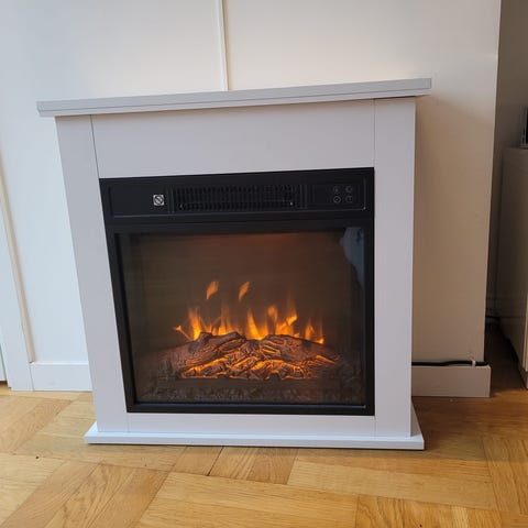 Elektrisk kamin i vit färg med realistisk lågeffekt och dekorativa vedträn. Passar för inomhusbruk och ger visuell eldliknande effekt utan öppen låga.