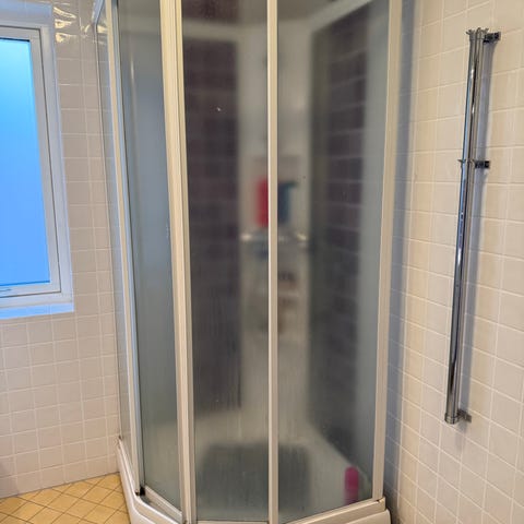 Duschen är i fint skick och kommer med ett nytt ouppackat duschdraperi anpassat för denna dusch. Duschen kopplas med medföljande avloppsrör till brunnen.