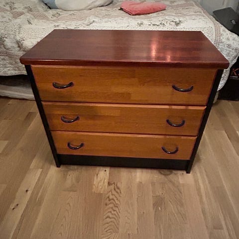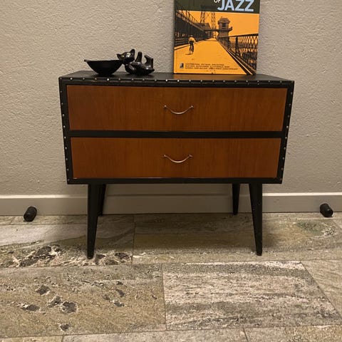 Jättefin byrå 50/60-tal i teak, för hall ,sovrum, sideboard. Små läderbeslag på lådorna. Mått bredd 57 höjd 55 djup 31 hämtas i Hornstull el Bromma