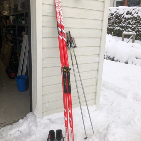 Längdskidor, pjäxor, stavar