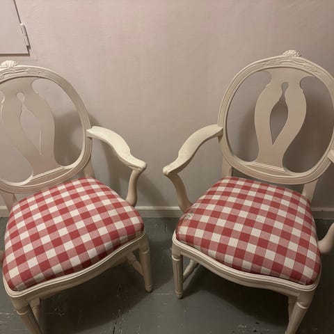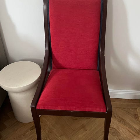 Stolen är renoverad och grundmålad – redo att målas i valfri färg och kläs i det tyg du önskar.