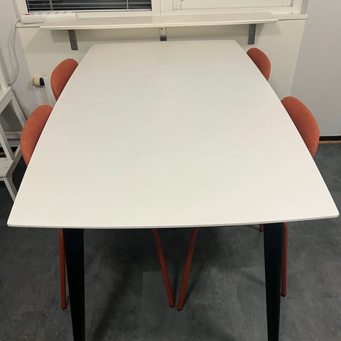 Bord med metallben, liten fläck efter blomkruka, ytan slät.