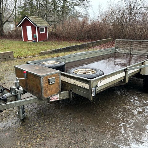 Traktor Tipp Släpvagn utrustad med svart presenning och pendlandeaxel. Släpvagnenär renoverad med smidesbeslag och har träpaneler plåt i botten .Måtten B 170cm längd 340 Lämarnas höjd två gånger ca 20cm och är avtagbara. Tippar med hög vinkel ny hydralslang och kopplingar En bit plåt är dålig i botten. Vill och behöver inte sälja vagnen men till en trevlig person som uppskattar vagnen säljes till högst bjudande. Och jag säljer vagnen till den jag vill😃 välkommen för en trevlig affär