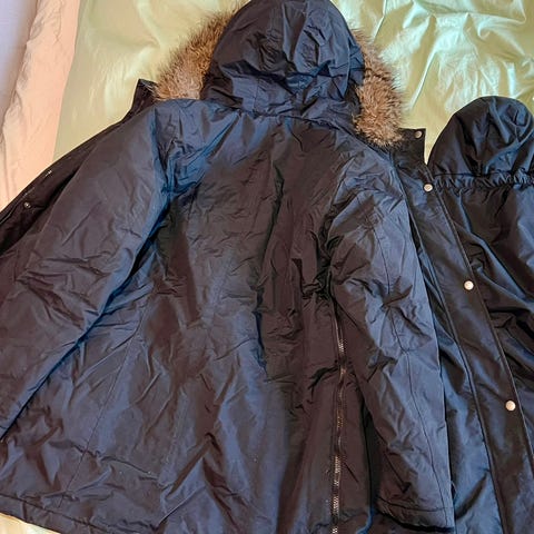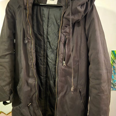 Fodrad gravidjacka med ståkrage, huva, dragsko under bysten och avtagbar bärpanel. Bärpanelen är fodrad med mjuk pile och har dragsko, mysigt och varmt för bebis.