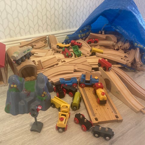 BRIO Träjärnvägset för barn i trä med tågvagnar, räls, broar och station. Setet innehåller 20 böjda och 3 raka spårdelar, ett stationshus samt två broar. Det ingår också 3 tågvagnar i olika färger (med djur), tågvagnarna tror jag inte är Brio.