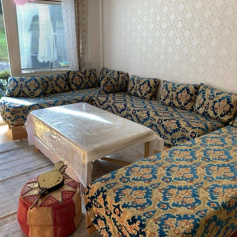 Säljer en klädsel som passar till bäddsoffan Friheten från Ikea. Passar endast då divanen är monterad till vänster. Klädseln är köpt från Bemz och är i kraftig bomull. Mönstret är designat av Göta Trädgårdh. Den delen som ligger på divanen är ganska urblekt och lite slitet, men övriga delar är bättre. Tex är kuddarna jättefina fortfarande, så man kan ju använda bara dem om man vill. Bakstycket är också jättefint och det tyget kan ju användas till något annat om man inte vill använda hela klädseln. Nypris var ca 3000-4000kr.