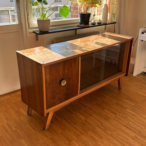 Äldre radiomöbel från mitten av 1900-talet med en del för barskåp med glasad skjutdörr och en del för radio och grammofon (grammofonen saknas dock). Den fungerar inte (så vitt jag kan bedöma).