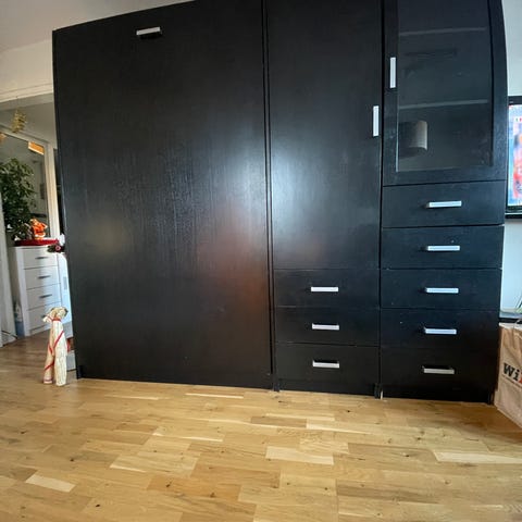 Sängen fälls smidigt ner från skåpet. Stabil metallram, stoppfunktion och bälten som gör att sängkläder kan ligga kvar när sängen fälls upp.