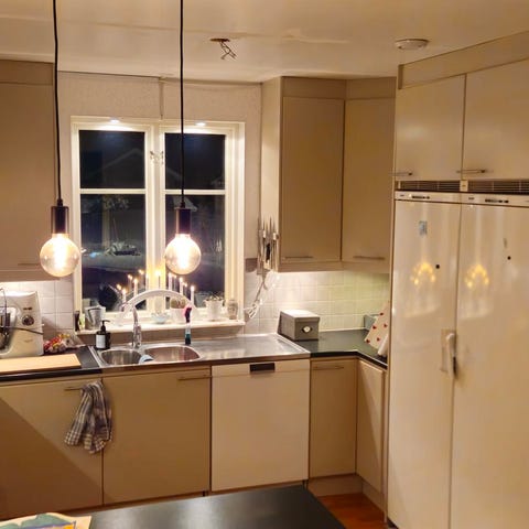 Köket har ett par år på nacken och på många ställen syns skavanker, exempelvis på hyllorna i skåpen där det på vissa ställen börjat lossna (se bild).