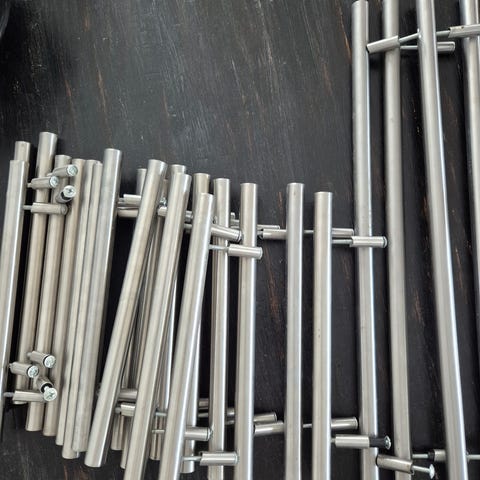 Tre rostfria stånghandtag av okänt märke. Handtagen är av metall och har en slät, borstad yta. De är avsedda för montering på dörrar eller skåp och levereras som ett set om tre.