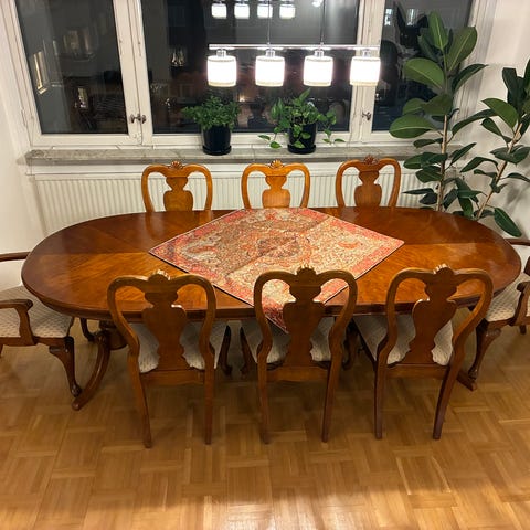 Bord i mörk ek,utdragbart och 8 stolar. Ser ut att vara 1930-tal med fina former och ben som ser art noveau / art deco ut på både bord och stolar. Stolsdynor enkla att klä om. Bordet är 78 cm högt och 100 cm brett, längd 129 cm. Helt utdraget är bordet 222 cm långt. Stolar mäter 46 cm sitthöjd, totalhöjd 102 cm och är 45 cm breda i framkant.
