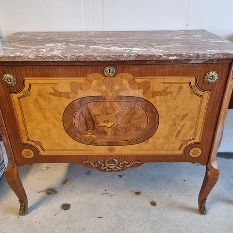 Säljer en antik byrå i gustaviansk stil. Byrån har två lådor och en fin marmorskiva. Byrån är i gott skick.