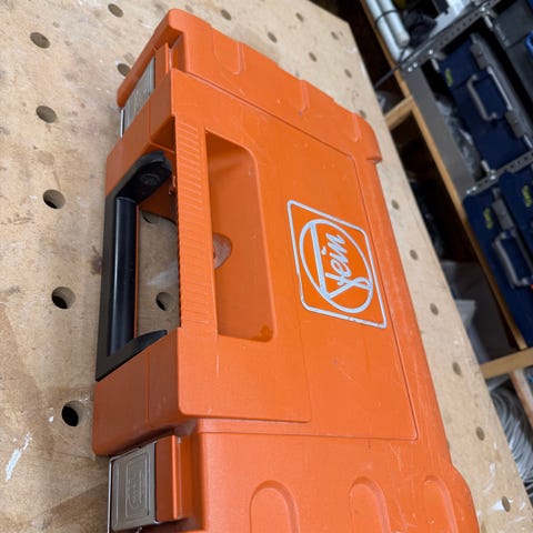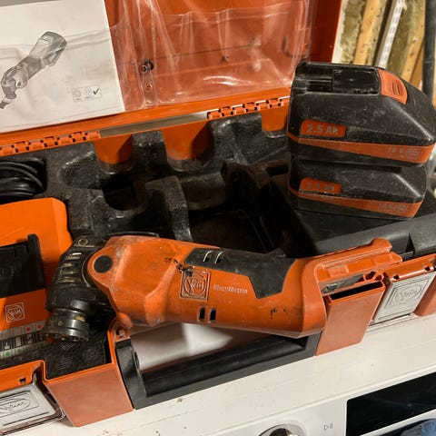 FEIN MultiMaster FMM 250 multiverktyg med tillbehör i orange förvaringsväska. Verktyget har en svart och orange design med elektrisk sladd för strömförsörjning. Kraftfull och pålitlig maskin, perfekt för renovering, snickeri och precisionsjobb.
