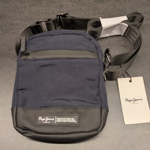 Väskan har två handtag i läderimitation samt en justerbar axelrem. På framsidan finns en broderad logotyp i gult och rött. Inuti finns ett fack med dragkedja och ett öppet fack.