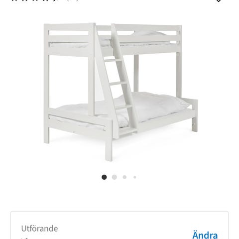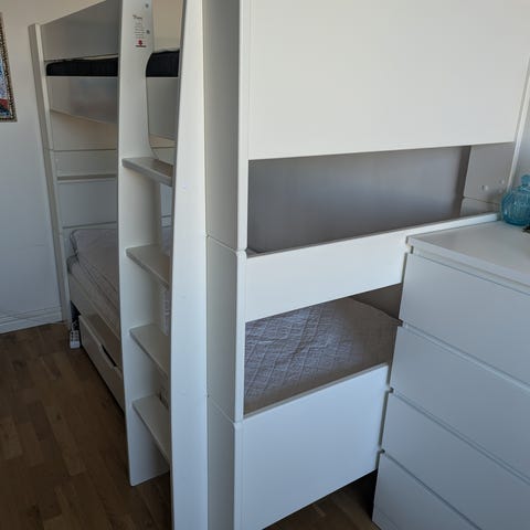 En perfekt familjesäng som skapar flera sovplatser på en begränsad yta. Den övre bädden rymmer en madrass med måtten 90x200 cm, och den undre 120x200 cm. Sängens höjd är 169 cm.