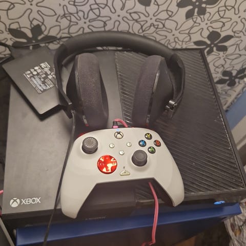 Xbox One spelkonsol med handkontroll. Konsolen är svart och levereras med två spel.