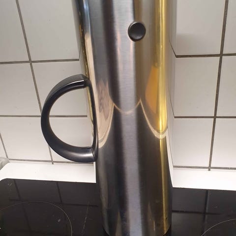 Termoskanna med volym på 1,3 L i rostfritt stål. Praktisk och stilren. Sparsamt använd och i princip bara för tevatten.