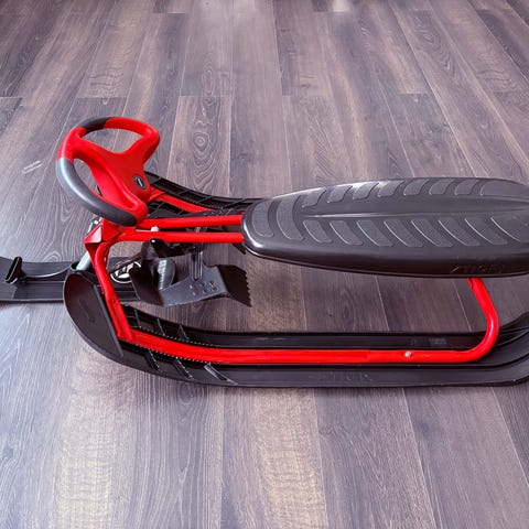 Stiga Curv snowracer med ratt och broms. Barnsparken är svart och röd och har en robust konstruktion. Den är ganska stor så man kan enkelt åka två barn men även barn + vuxen utan problem.