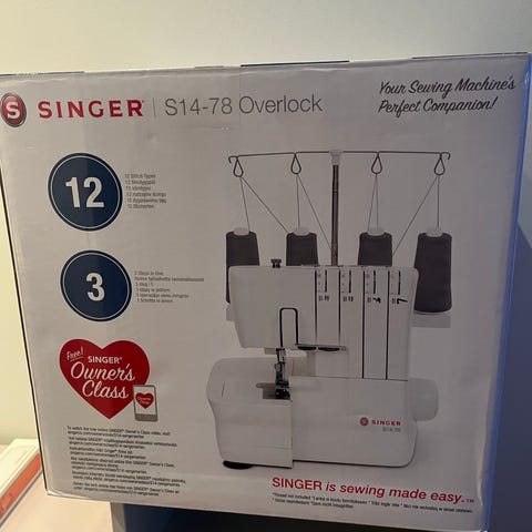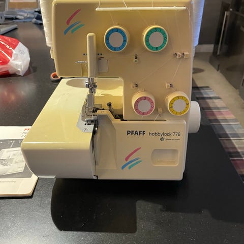 Bernina L450 Overlock symaskin med flera trådspolar och justerbara reglage för olika sömnadstekniker. Maskinen är utformad för att skapa överlocksömmar och kan användas för att sy och avsluta kanter på olika textilier.