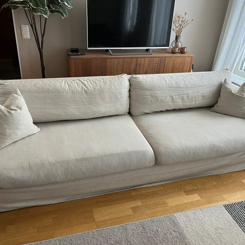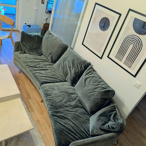 Soffan har en rund form och ett elegant uttryck. Med ett sittdjup på 86 cm erbjuder den ett bekvämt och upprätt stöd, vilket gör den lika funktionell som stilren. Soffan har stora ryggkuddar. Stommen är byggd i massivt trä och plywood, och sittdynorna har en stadig kärna av kallskum med ett mjukt toptäcke. Klädseln är fäst med kardborreband och är avtagbar, vilket gör den enkel att rengöra och underhålla. Sammanlagt har soffan 2 extra ryggkuddar och 3 kuddar som andvänds som nackstöd.