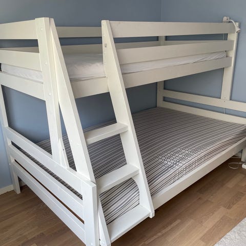 Mavis Sunne är en familjesäng med bäddmåtten 90x200 cm för den övre bädden och 120x200 cm för den undre. Det är tillräckligt med höjd för att kunna sitta i den undre bädden.
