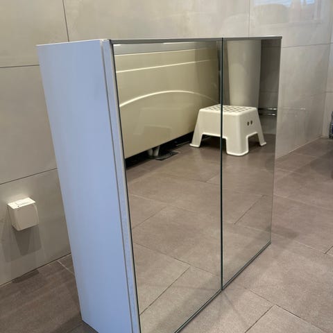 Ikeaskåp, grått med speglar och glashyllor invändigt, mått 800x970 mm