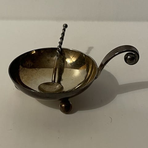 Georg Jensen Saltkar med sked i silver och blå emalj