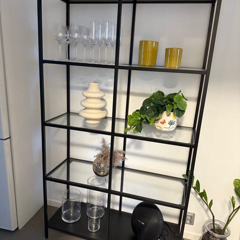 Vittsjö hylla av metall och härdat glas. Justerbara fötter som gör att den står stadigt även på ojämna golv.