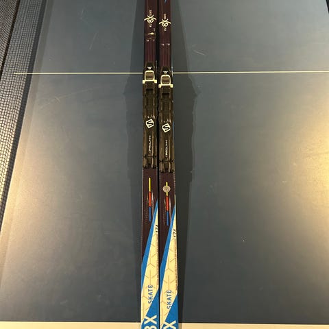 Skidorna är endast använda två ggr under en säsong, sedan dess förvarade i kallförråd. Skidorna är 174 cm långa med stavar som är 130 cm.