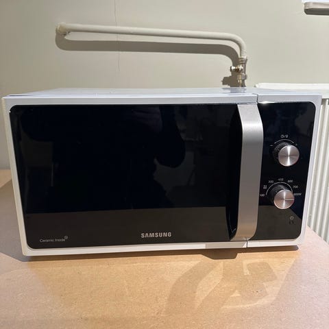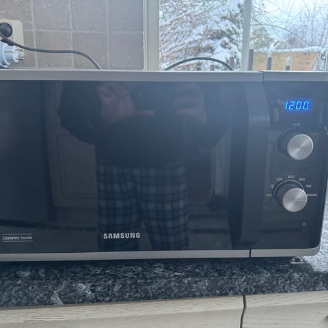 Samsung mikrovågsugn i svart färg. Utrustad med två reglage för inställning av tid och effekt. Passar för uppvärmning och tillagning av mat. Finns liten defekt på handtaget men fungerar utmärkt
