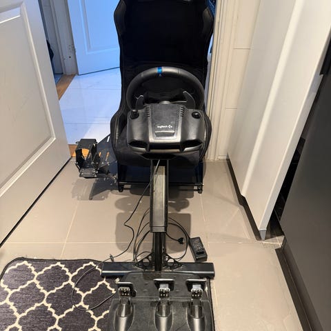 DXRacer Racing Series kontorsstol i grått tyg. Stolen har justerbara armstöd och ergonomisk design för gaming