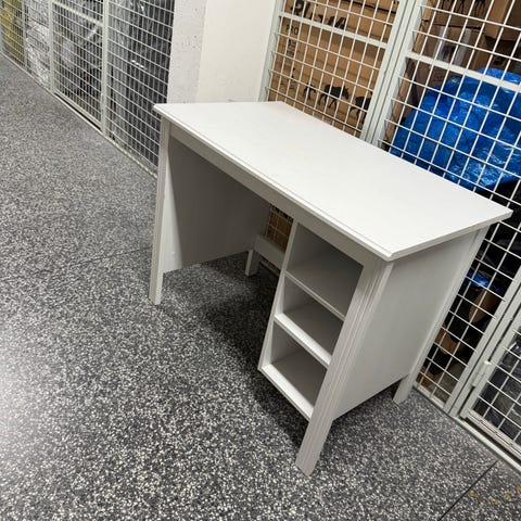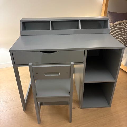 Liten skrivbord som passar barn up till 6 år. Justerbar höjd (60-80 cm) och skivan kan vinklas. Spår av användning, men fullt funktionell. Hämtas i Älvsjö/örby slott.
