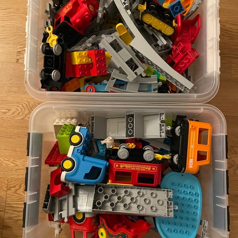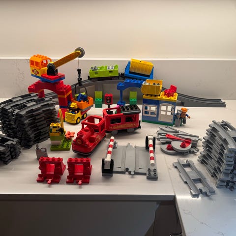 LEGO DUPLO tågset med flera tåg, räls, byggnader och figurer. Setet är utformat för yngre barn och innehåller färgglada delar som kan kombineras för att skapa olika tågsystem och scener. Tågen går på batterier och har olika ljud. Det är två olika set