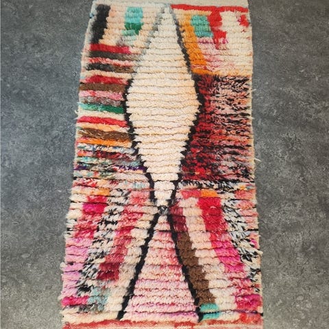 En handvävd marockansk matta från Azilal-regionen, tillverkad av mjuk, naturlig fårull. Mattan har en ljus bas med färgstarka, geometriska berbermönster som gör varje exemplar unikt. Den kombinerar traditionellt hantverk med ett modernt, konstnärligt uttryck och ger rummet både värme och karaktär.