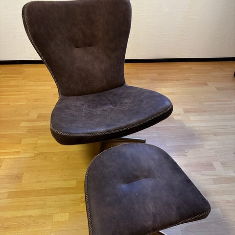 Mörk brun skinnfåtölj, manuell fällbar rygg med fotpall