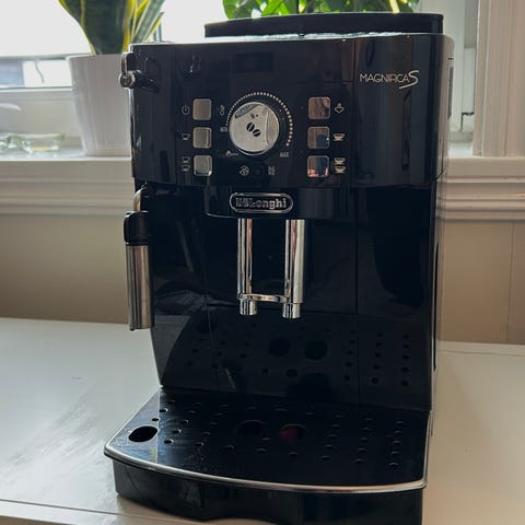 DeLonghi Magnifica S espressomaskin i svart färg. Enkel att använda. Den har en ångstav för skumning av mjölk och en droppbricka i metall. Nypris 2995:-. Några år gammal.