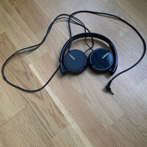 Sony JR410 trådlösa hörlurar i röd färg. Modellen är utformad för att ge stereoljud med basförstärkning. Hörlurarna är trådlösa och har en justerbar huvudbygel för anpassad passform.