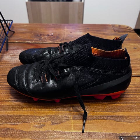 Puma fotbollsskor i skinn med dubbar i storlek 36 med svart överdel och orange detaljer.