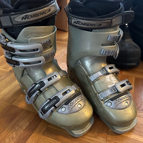 Alpinjäxor Lange strl 23,5 cm. Yttermått 275 mm. Bra använt skick, en del repor på utsidan, ej nötta invändigt. Finns att hämta i Uppsala (Norby).