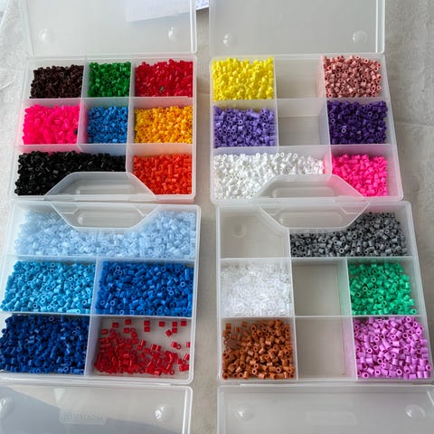 Pärlor och plattor. Pärlor i sorterade färger, samt en fack med blandade.