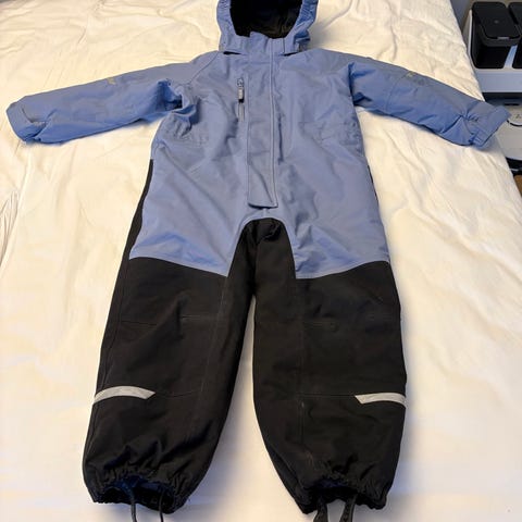 Polarn O. Pyret overall för barn i storlek 98, svart färg och tillverkad i polyester. Overallen är avsedd för unisex-användning. Produkten har en skada på ena benet enligt bild.