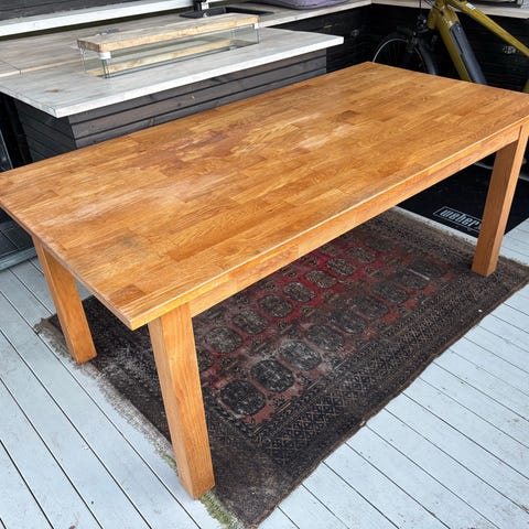 Bordet är i gott bruksskick och mycket stabilt konstruerat. Som bilderna visar har det använts med ett transparent ytskydd för att bevara skivan, men det finns naturliga spår av användning (skavanker) som ger bordet en fin patina. För den händiga kan bordet enkelt slipas och oljas/betsas om för att få ett helt nytt utseende, men det fungerar utmärkt precis som det är.
