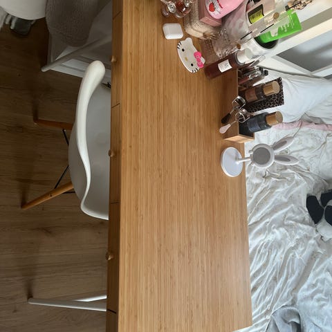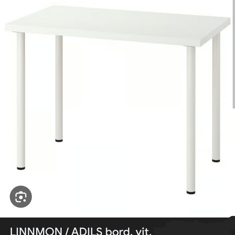 IKEA Linnmon bord i björk, med vita fyrkantiga ben. Bordsskivan har några märken längs ena kanten (syns knappt mot vägg). Passar för hemmakontor eller arbetsplats, eller som ett matbord.