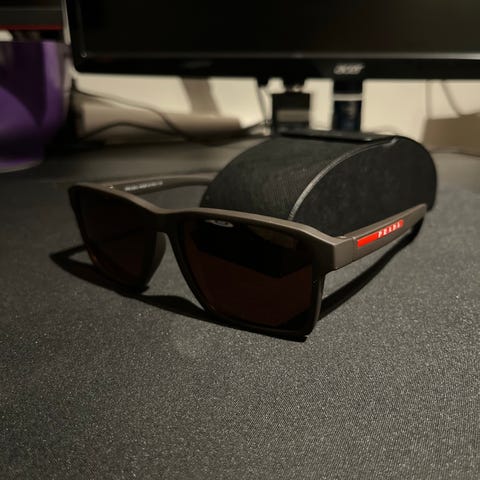Prada herrglasögon. Inkluderar fodral och rengöringsduk. Glasögonen har en modern design med mörka bågar och tonade glas. Helt nytt skick.
