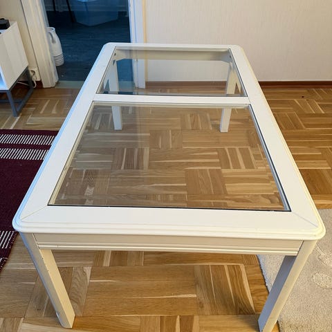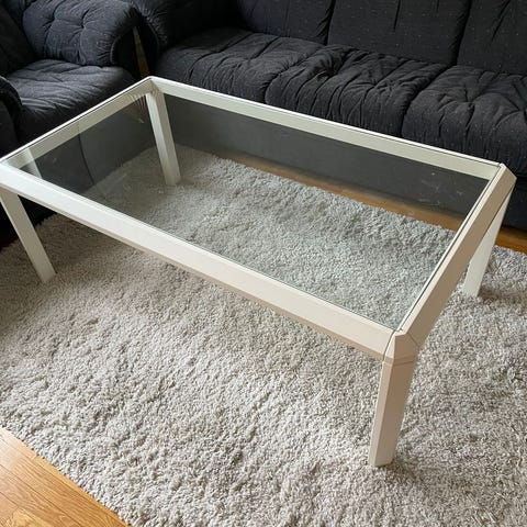 Soffbord med glasskiva och metallben. Inköpt 2020. Bruksslitage men i överlag gott skick.