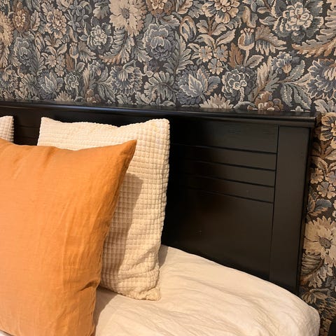 Sänggavel i grå melerat tyg.