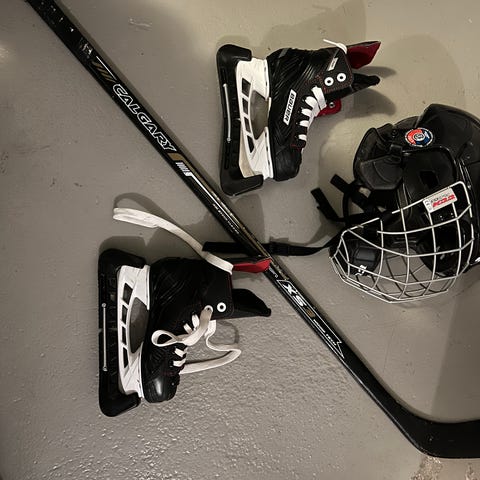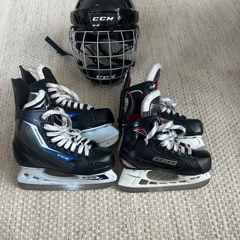 Allt för 300kr annars följande priser CCM Ishockeyhjälm med galler i svart färg storlek 10.0 100kr. Bauer Ishockeyskridskor i svart och vitt med snörning stl 36 250kr .CCM handskar i blå färg stl 9" 23 cm 150kr