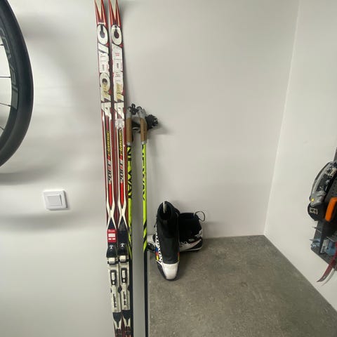 Ett paket med Madshus längdskidor Hypersonic Classic med Rottefella bindningar. 195 cm långa med stavar i fodral. Stavarna är Salomon Escape aluminium stavar.